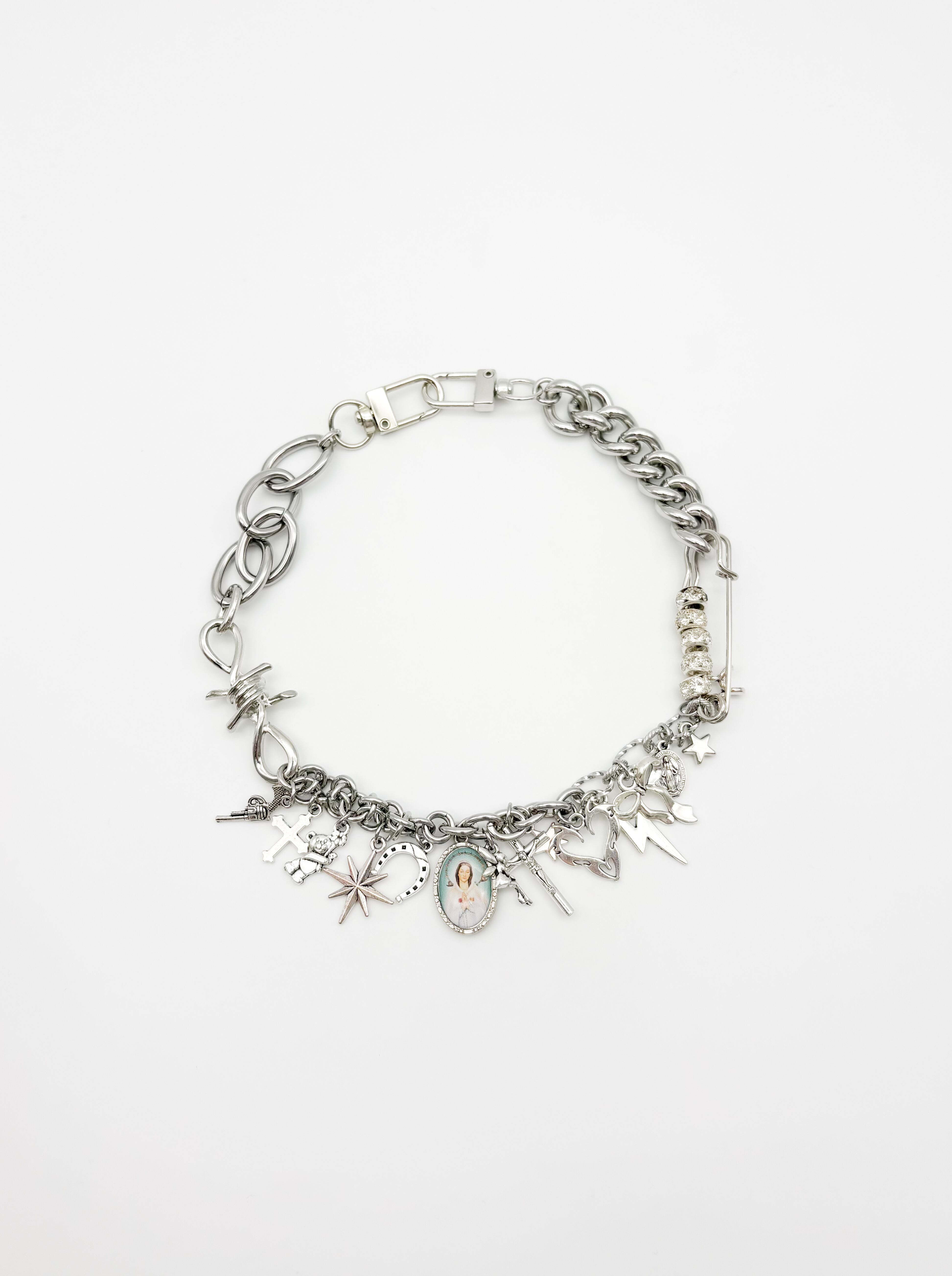80’sカルチャーを思わせる遊び心あふれるチャームをたっぷりとミックスしたチェーンネックレス。