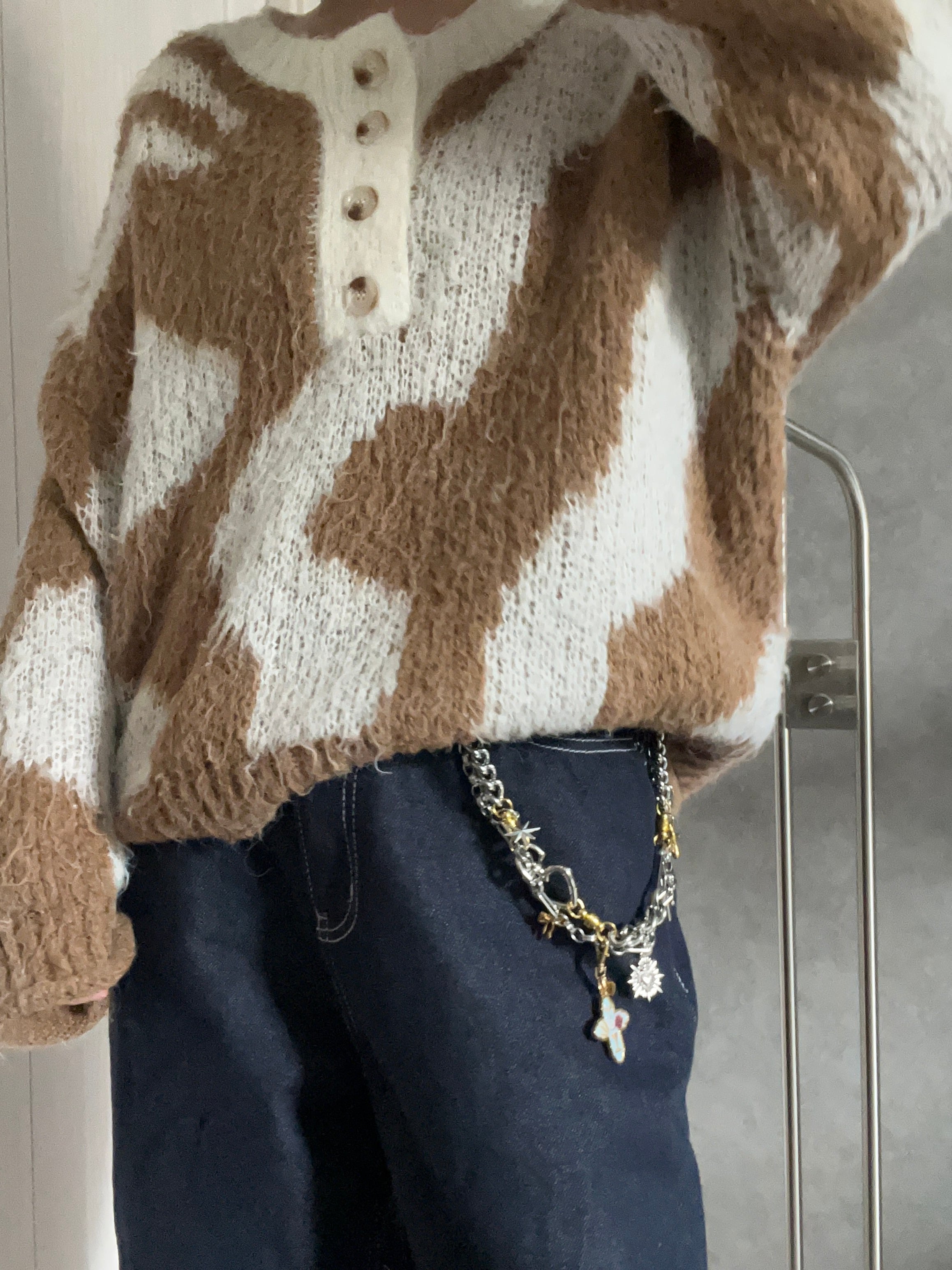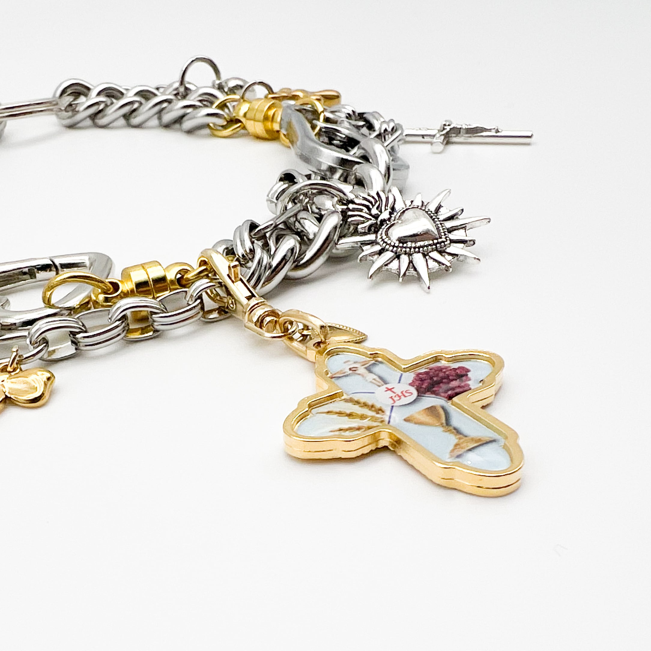 ゴールドとシルバーをミックスしたチェーンに、クロスやハートなどのチャームを組み合わせたマルチウェイアクセサリー。