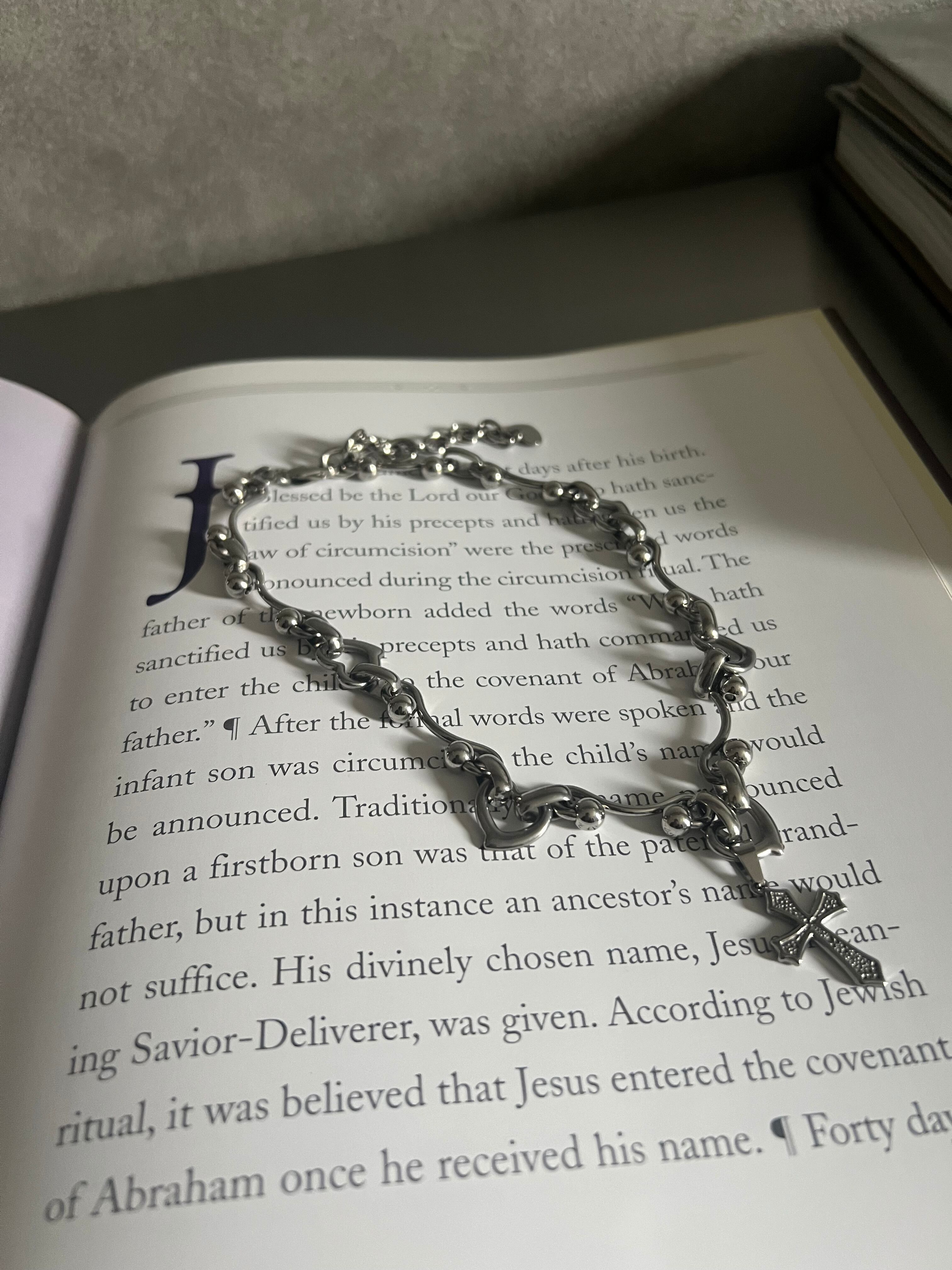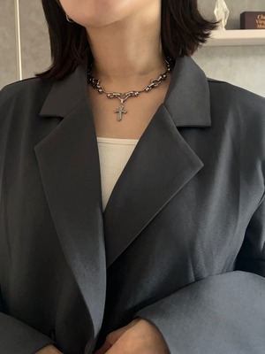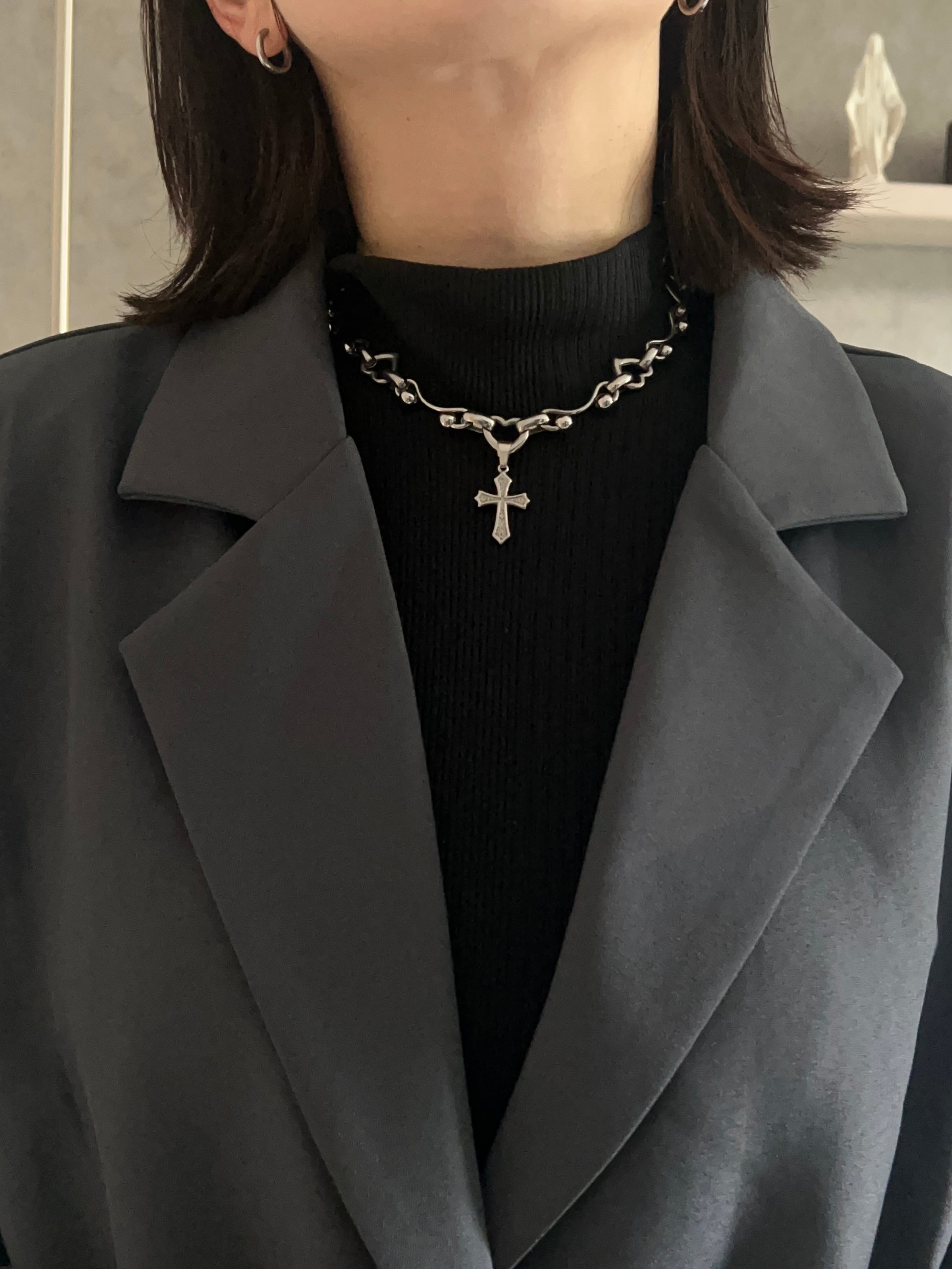ハートモチーフを連ねたチェーンに、繊細なクロスチャームを合わせたネックレス。