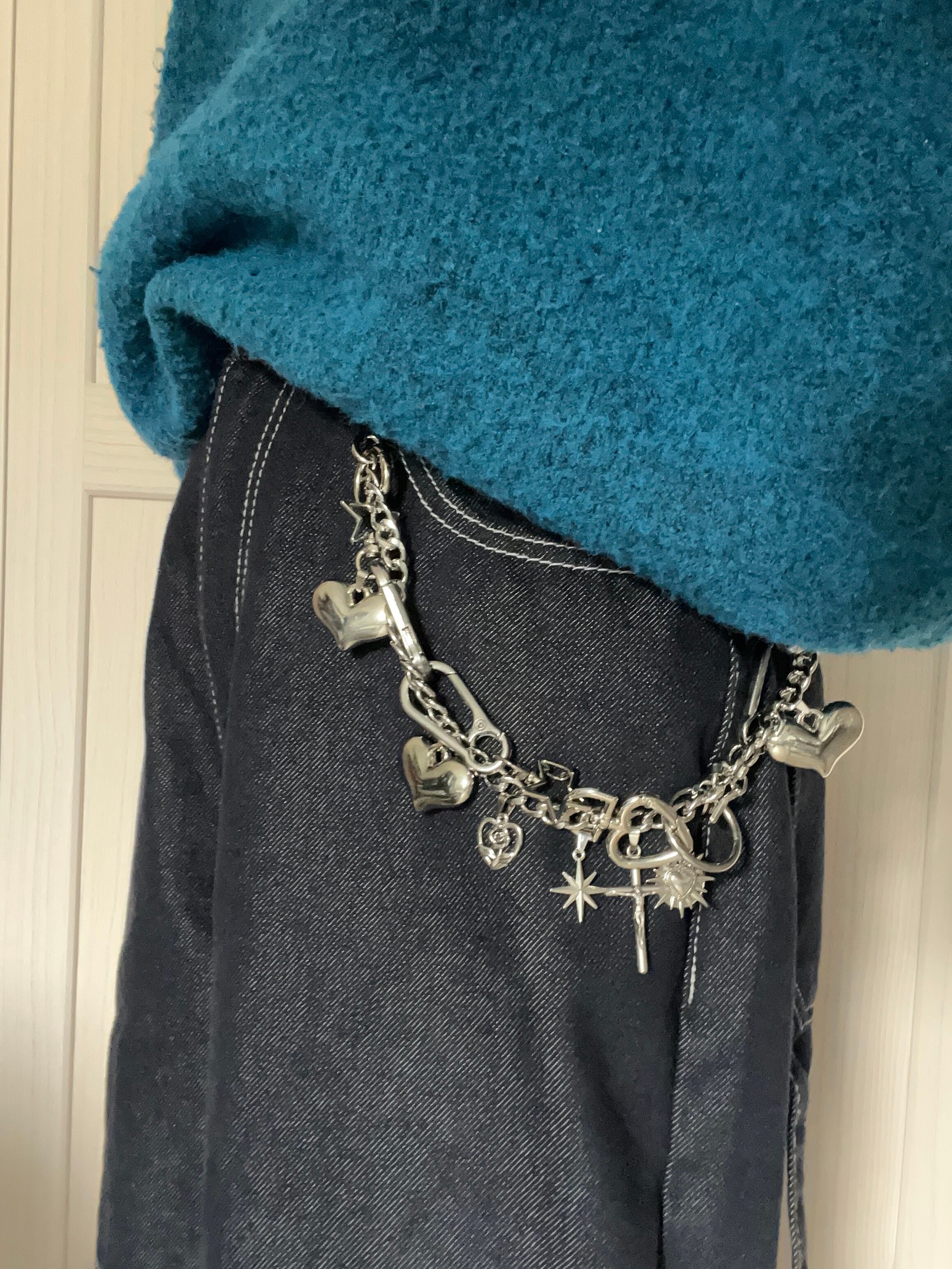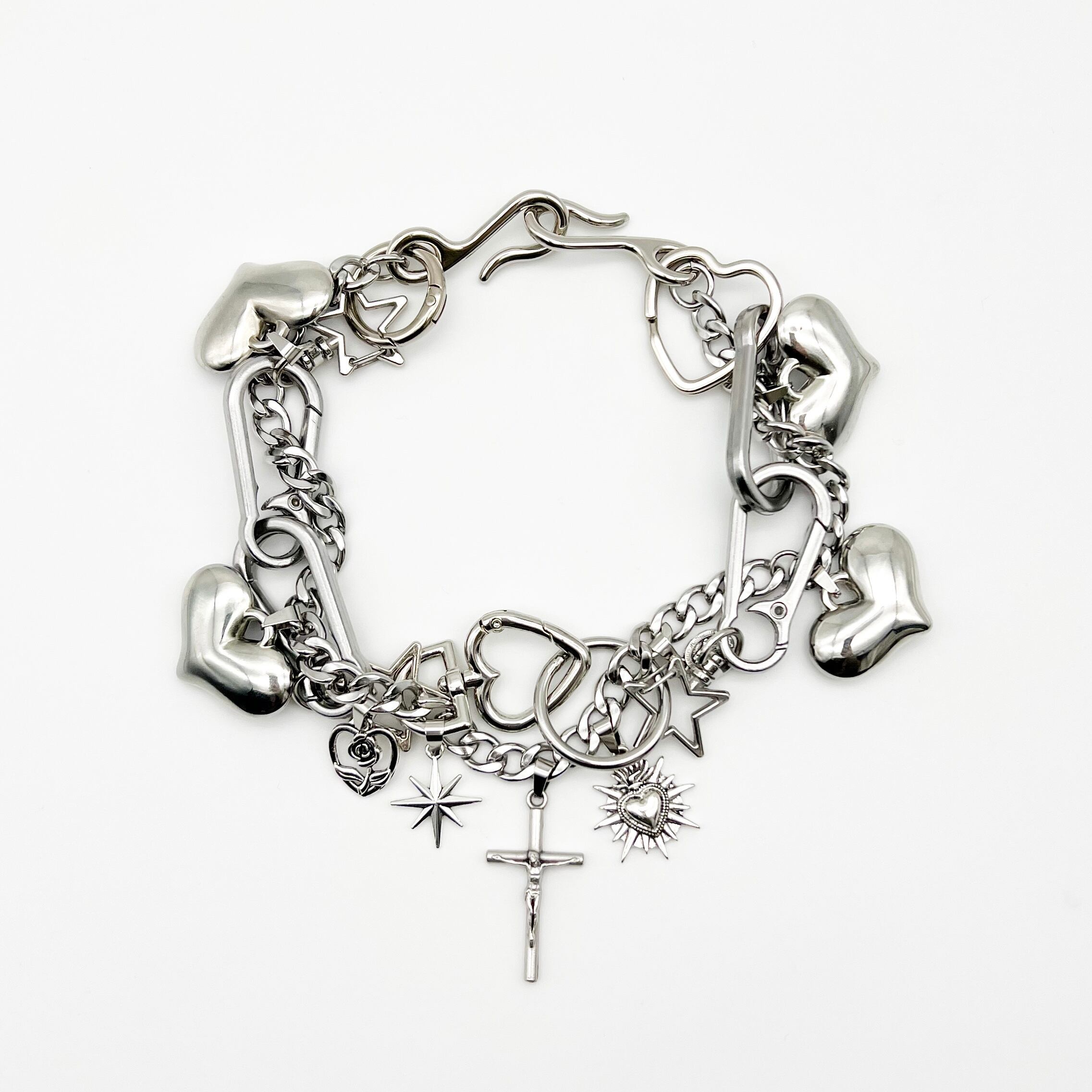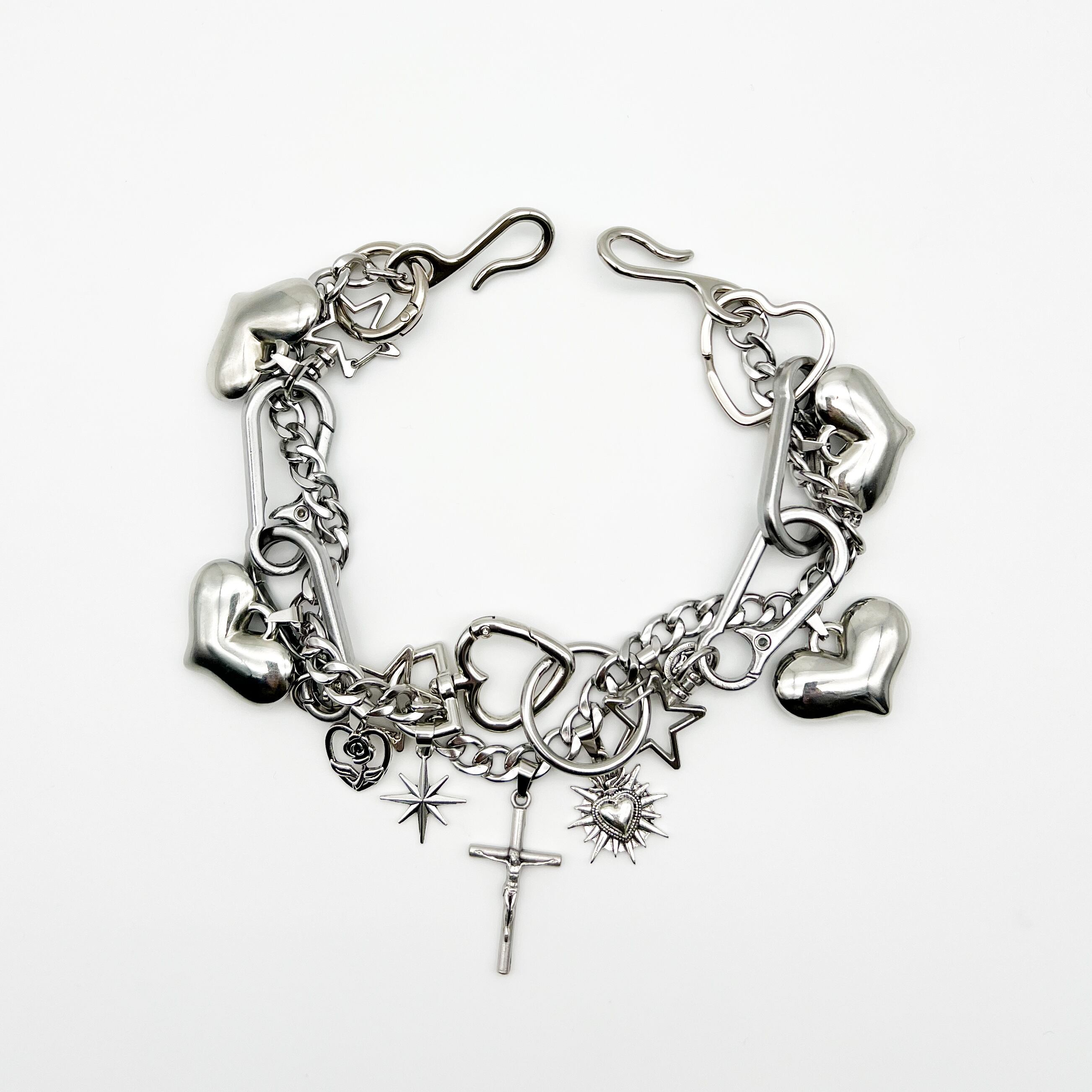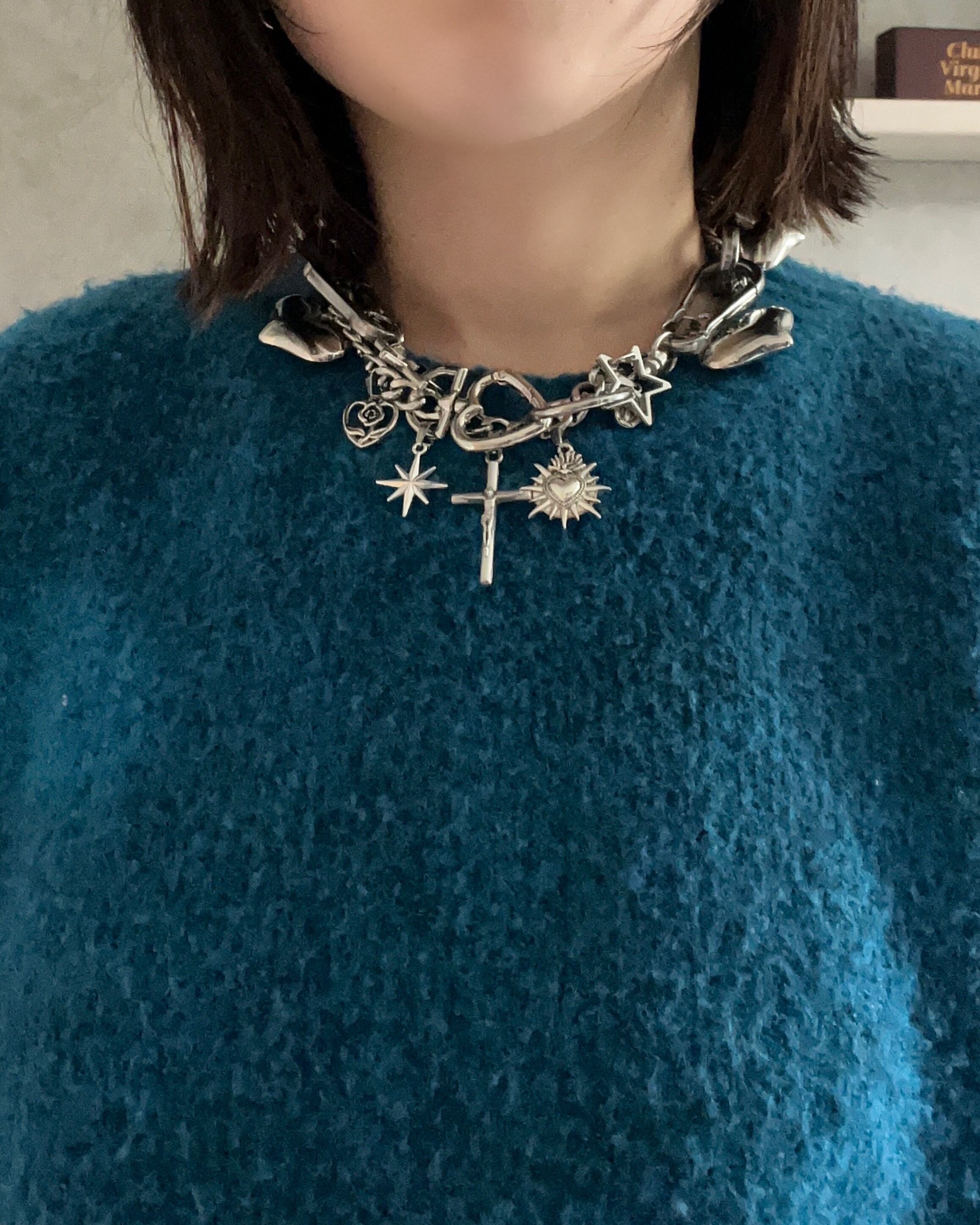 立体感のあるハートモチーフに、クロスやスターのチャームを組み合わせたチェーンネックレス。