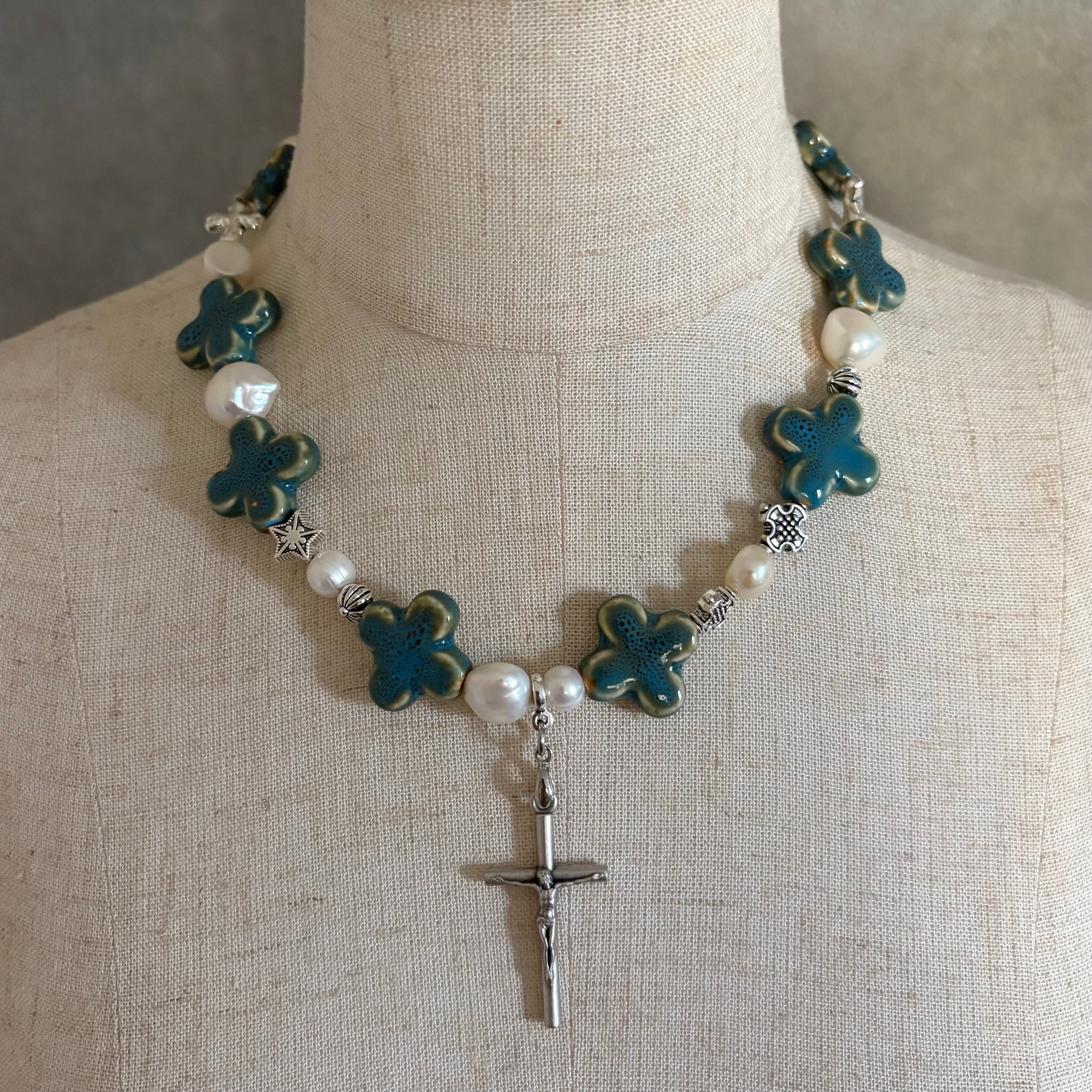 セラミック素材のクロスビーズに、淡水パールとシルバービーズを組み合わせたネックレス。