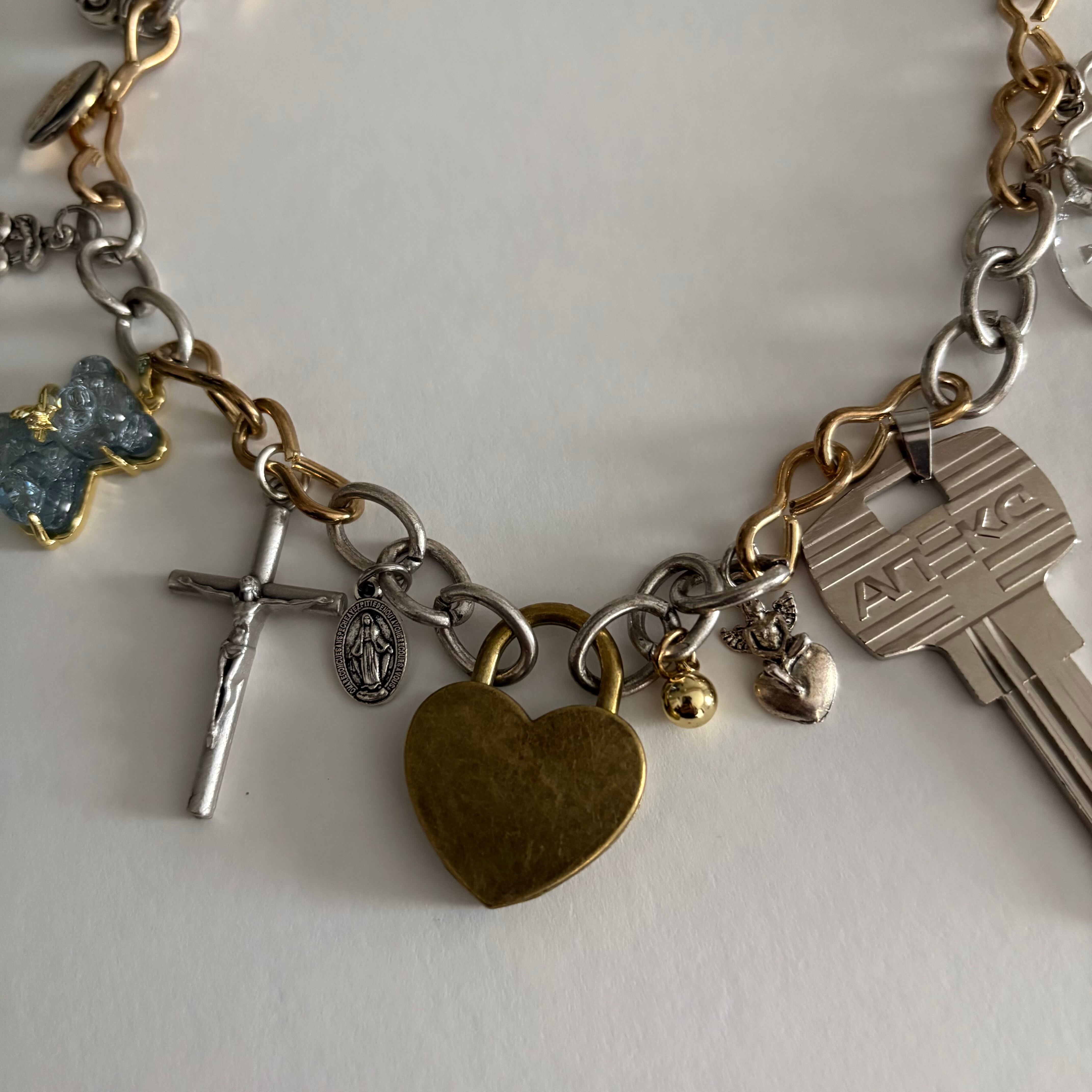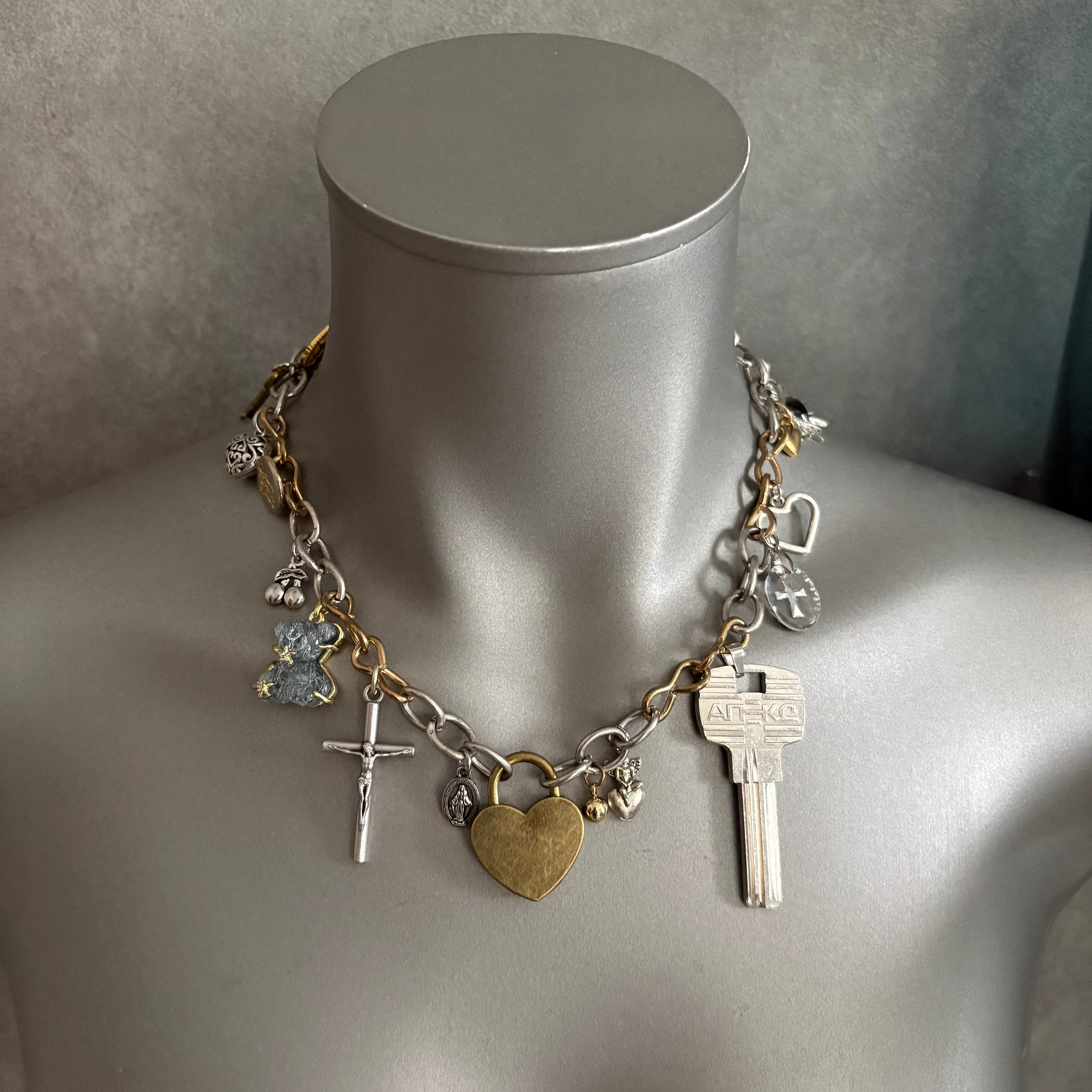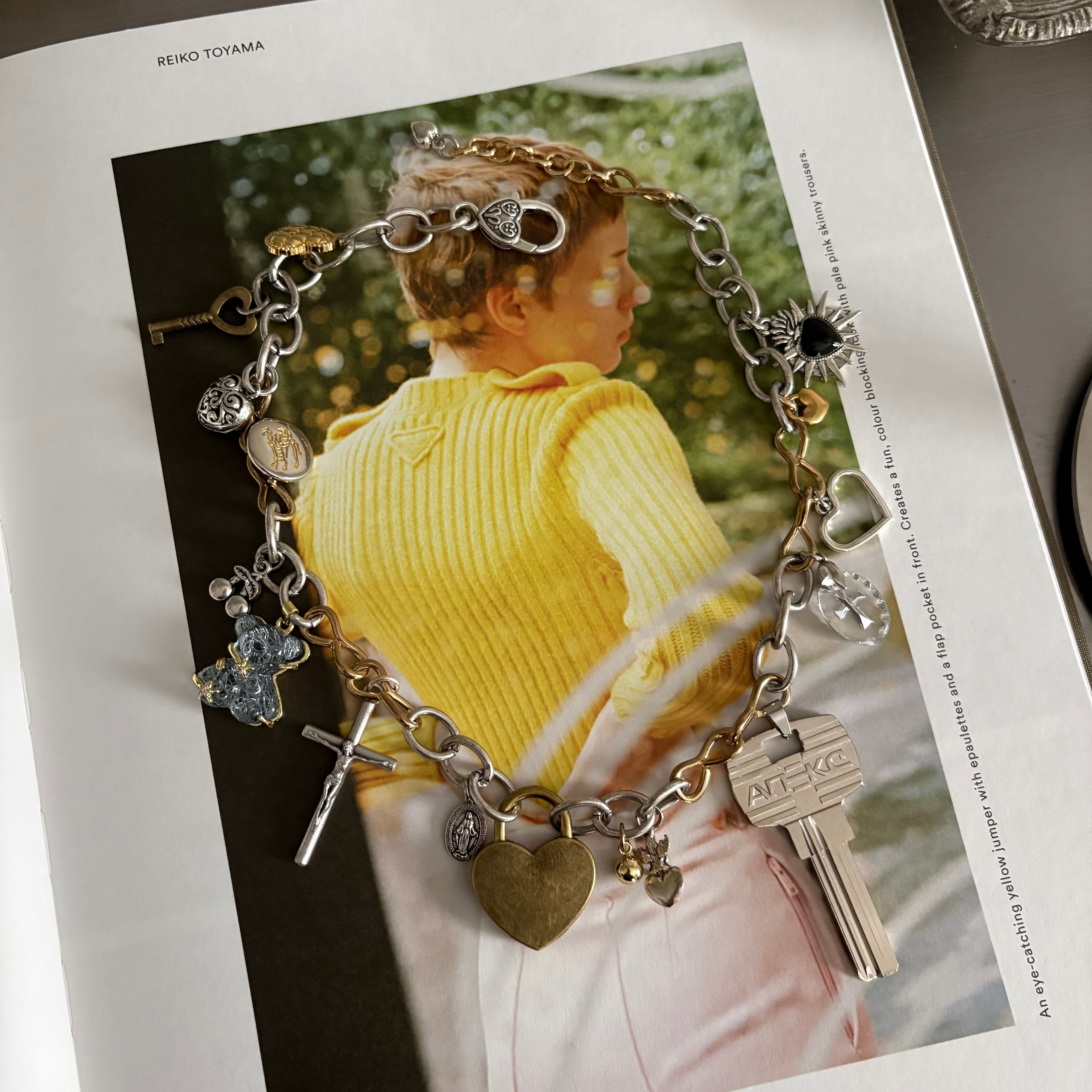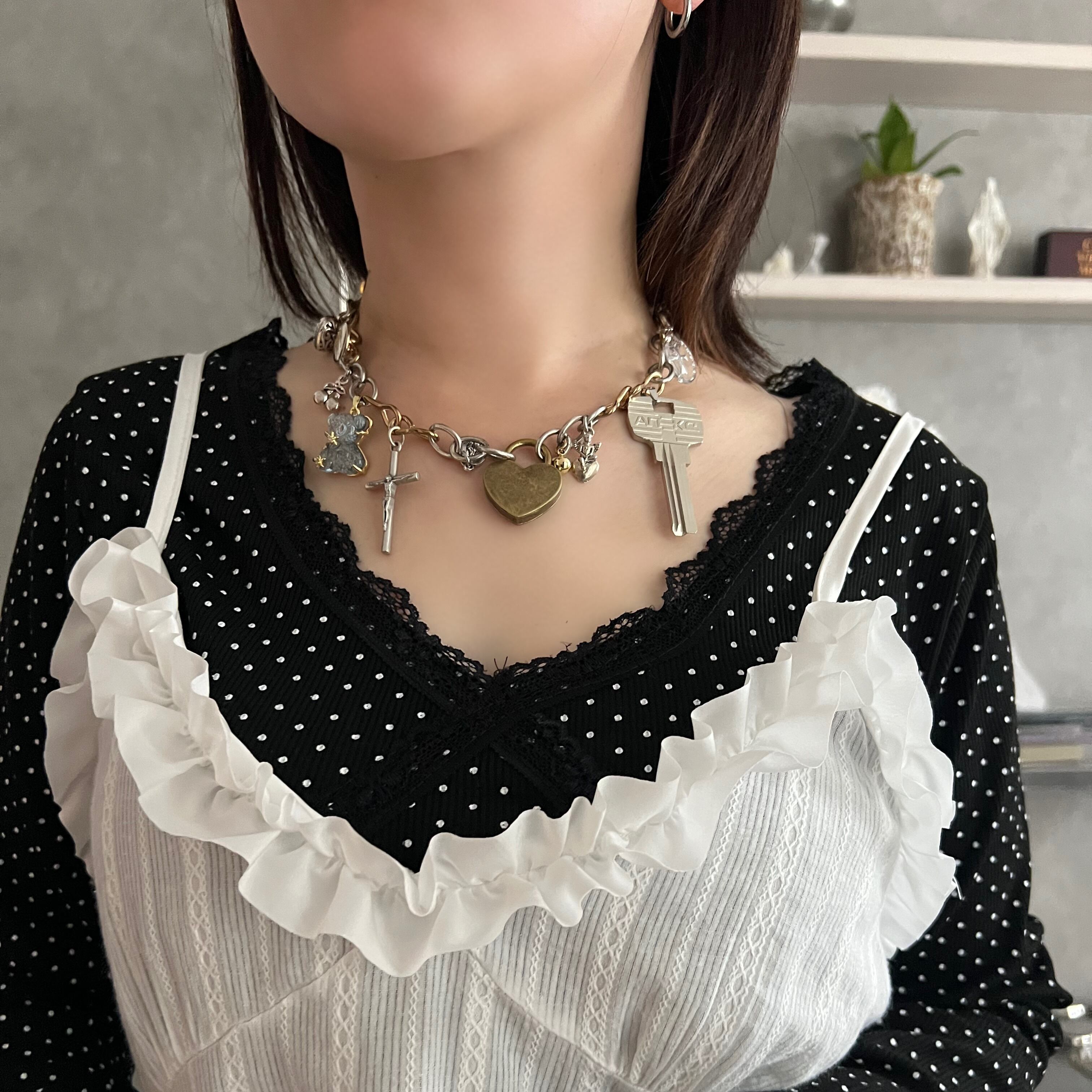 キーやクロス、ハートなどのパーツが揺れ、印象的なアクセントになっているネックレス。