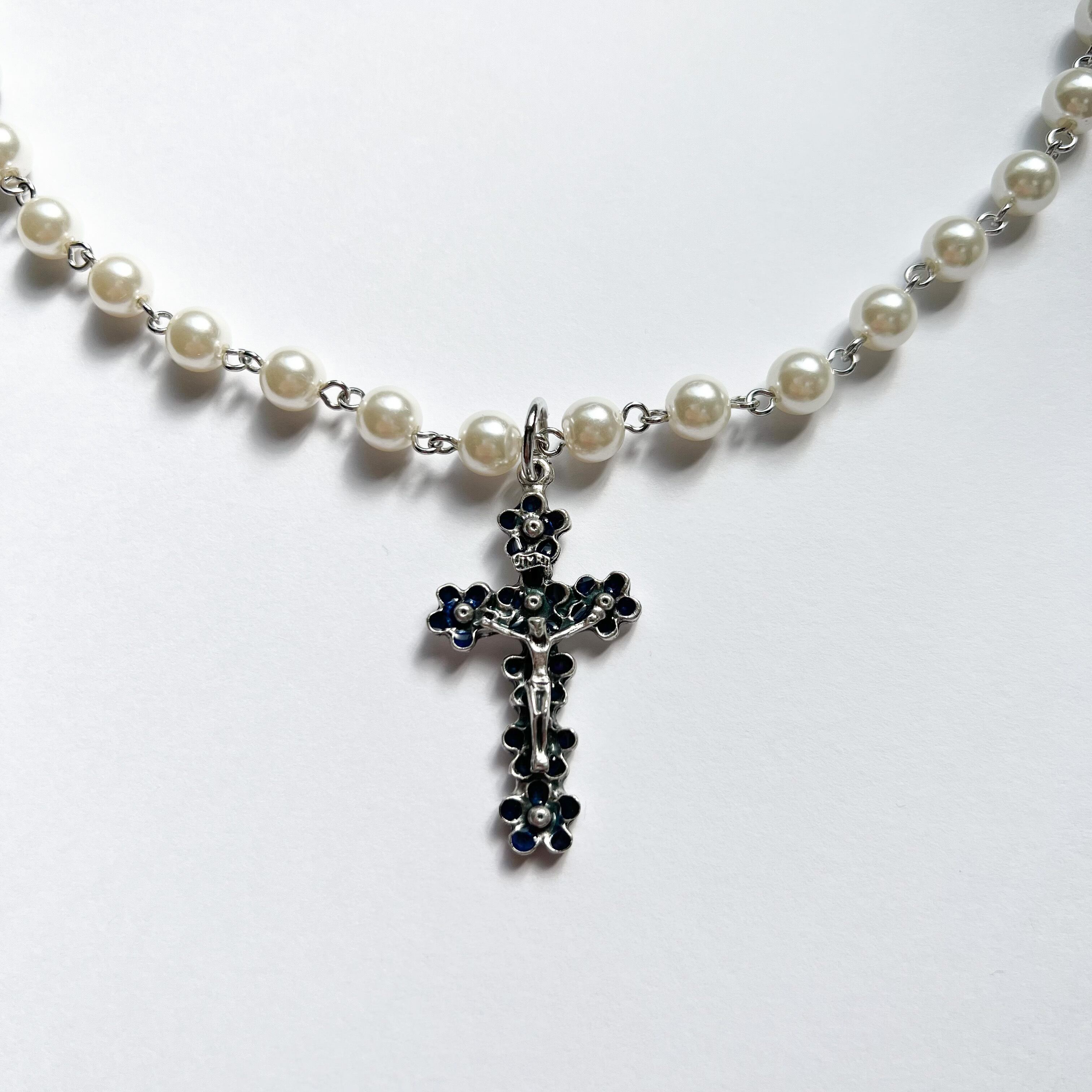 チェーンとパールのハーフネックレス。 お洋服を甘くも辛くも見せてくれます。 チャームはフラワークロスをセレクト致しました。 ※チェーンの長さは短く調整可能ですので、 お気軽にお申し付けください。 カラー:シルバー 全長約(留め具部分含む):52cm アジャスター:なし チェーン幅:1cm チャーム縦:4cm チャーム横:2.5cm 素材:鉄、真鍮、樹脂パール