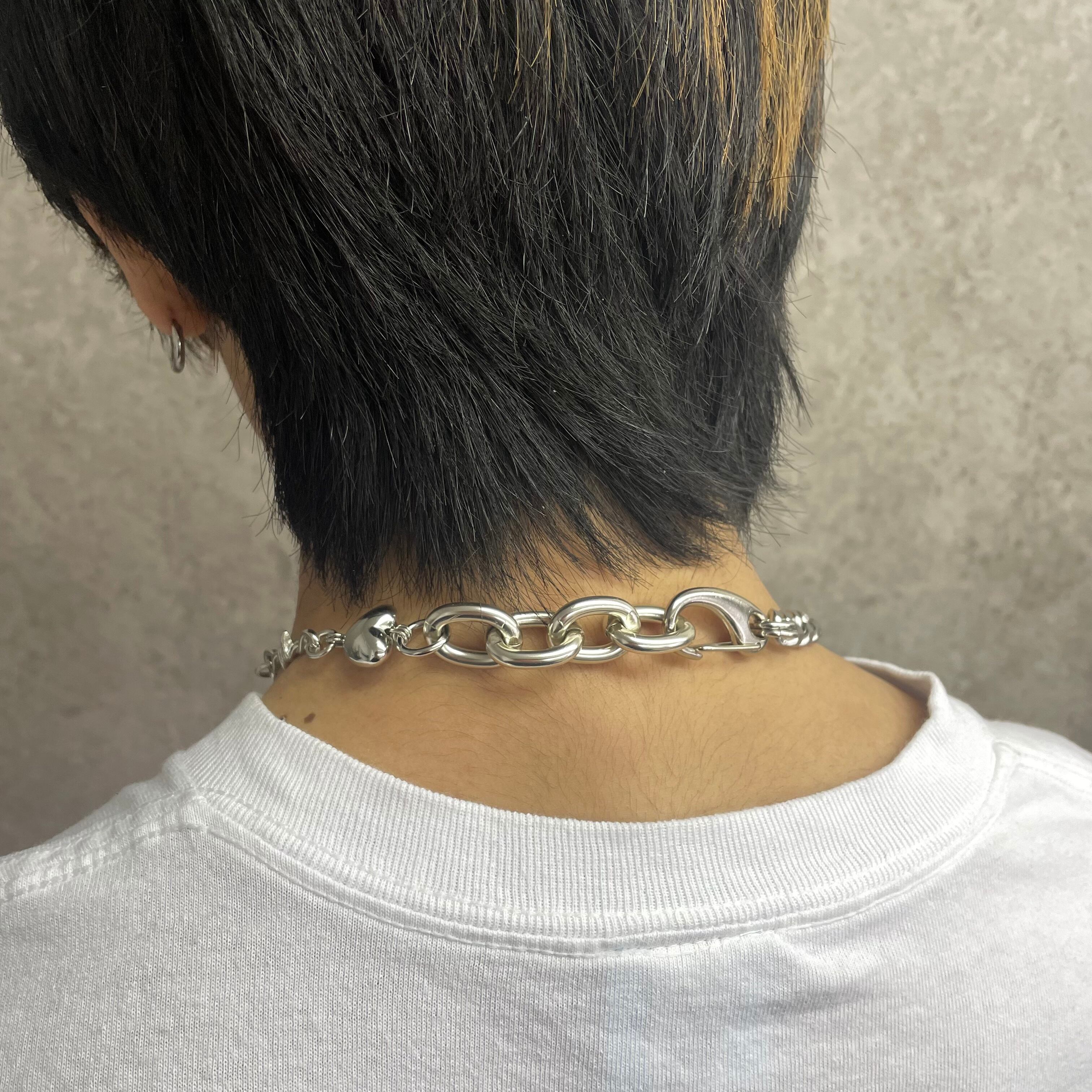 パンクチェーンや様々なモチーフを組み合わせたネックレス。