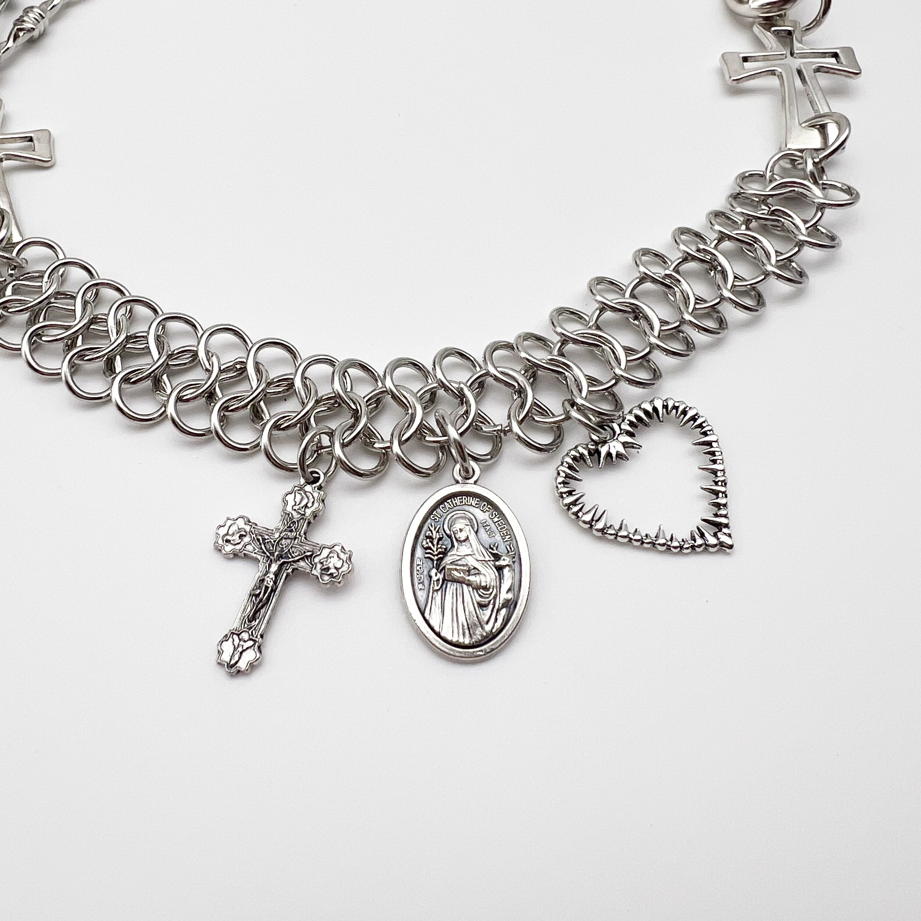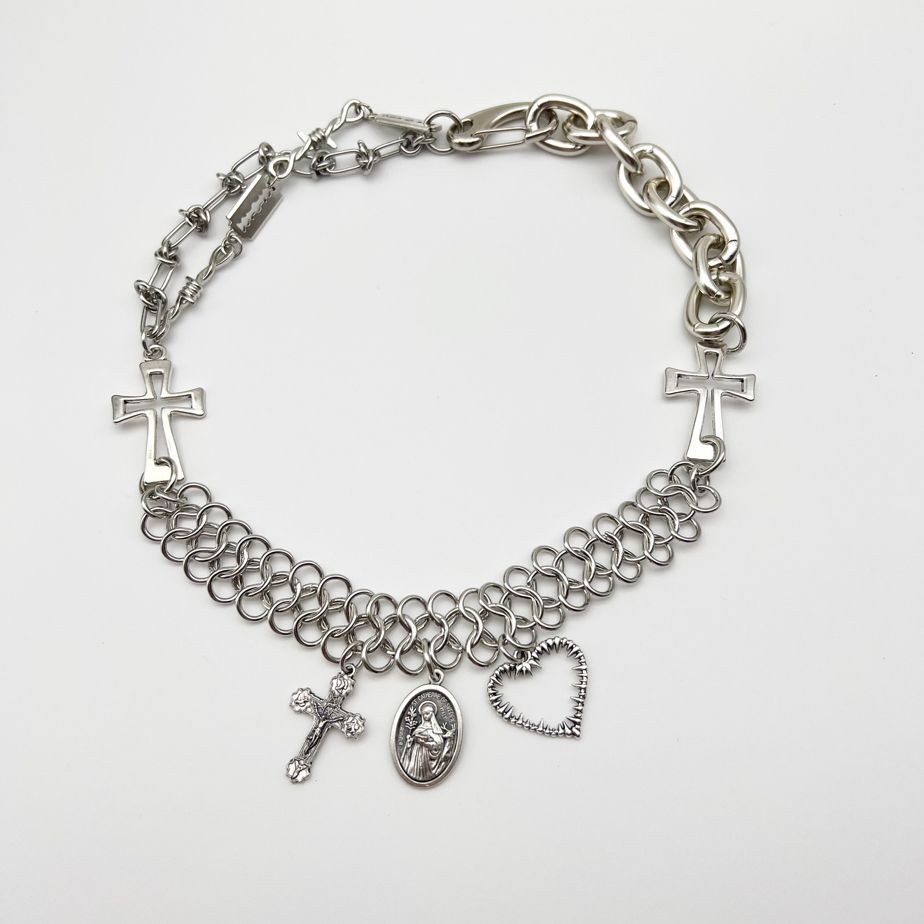 様々なチェーンとモチーフを組み合わせた 「crossover necklace」から新登場。 異なるデザインのチェーンを組み合わせた存在感 のあるデザインです。 ■カラー:シルバー ■全長約(留め具部分含む):約50cm ■チェーン幅:約1cm ■素材:ステンレス ■発送:7〜10日で発送 ※水や汗等、摩擦による色が変わる可能性が ございます。使用後は柔らかい布で拭いて ください。
