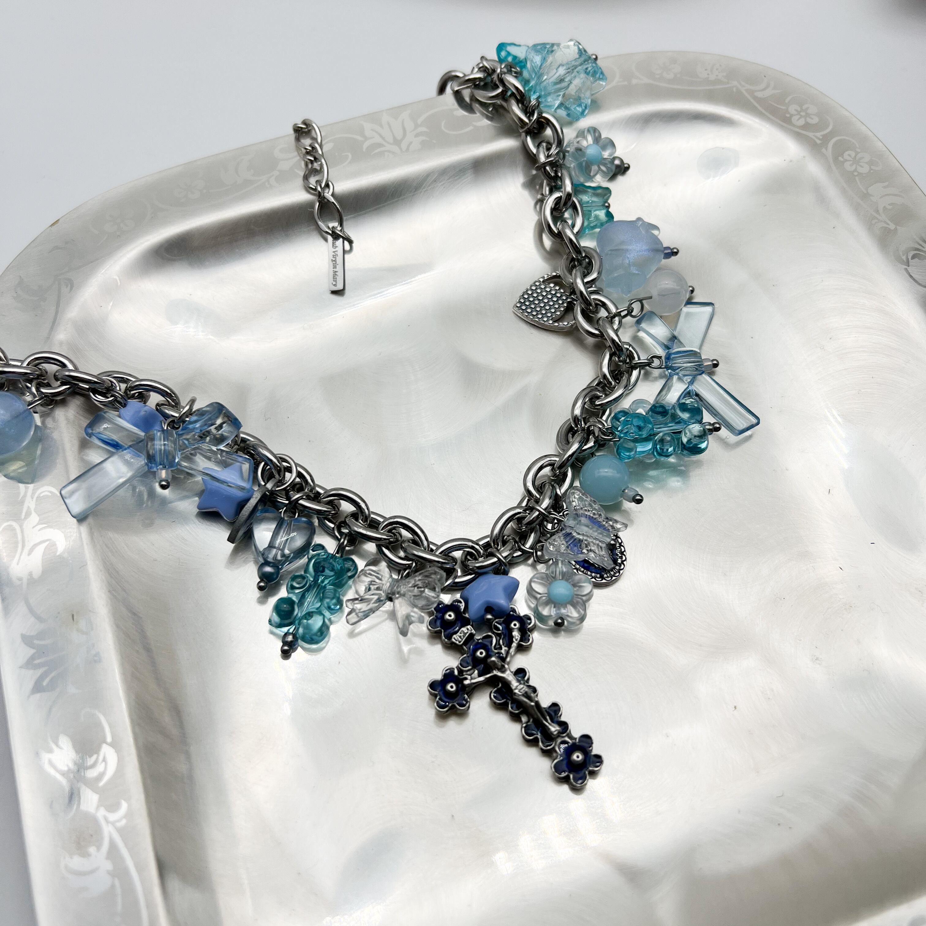 人気のブルーチャームとクリアビーズを