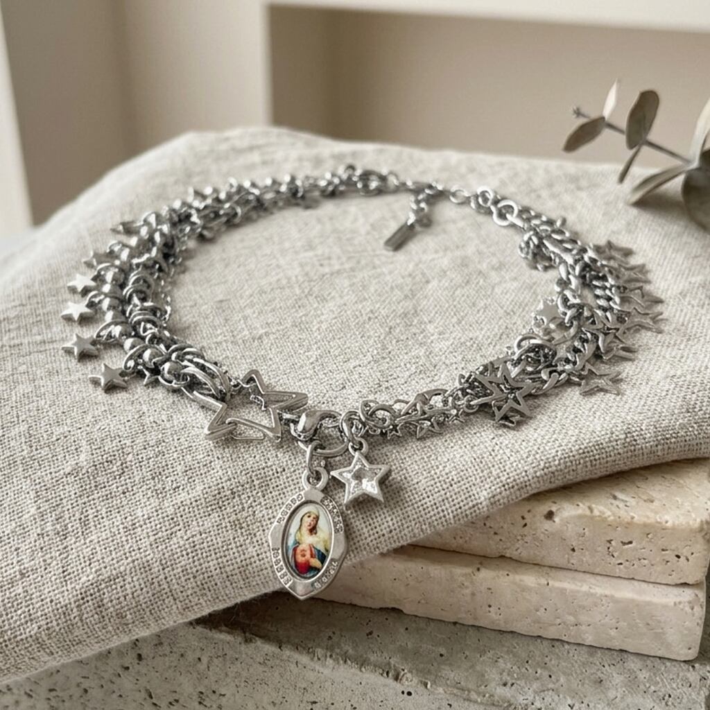 無数の星が散りばめられたネックレス。 首元を華やかに装飾してくれます。 マリア様のメダイがポイントです。 ■カラー:シルバー ■全長約(留め具部分含む):約39cm ※アジャスターは含みません。 ■アジャスター:7cm ■チェーン幅:約1cm ■素材:ステンレス/亜鉛合金 ■発送:3〜4日で発送 ※水や汗等、摩擦による色が変わる可能性が ございます。使用後は柔らかい布で拭いて ください。