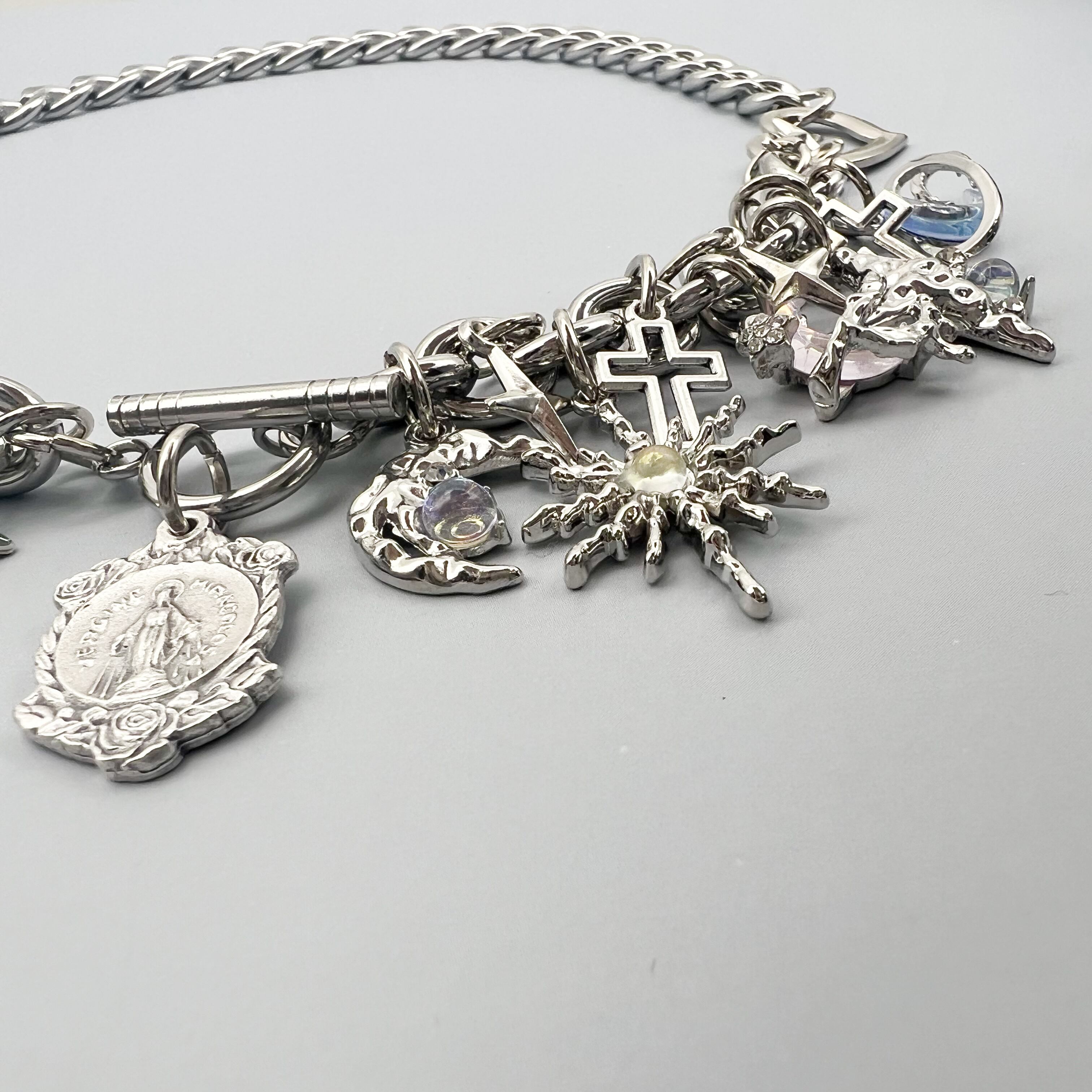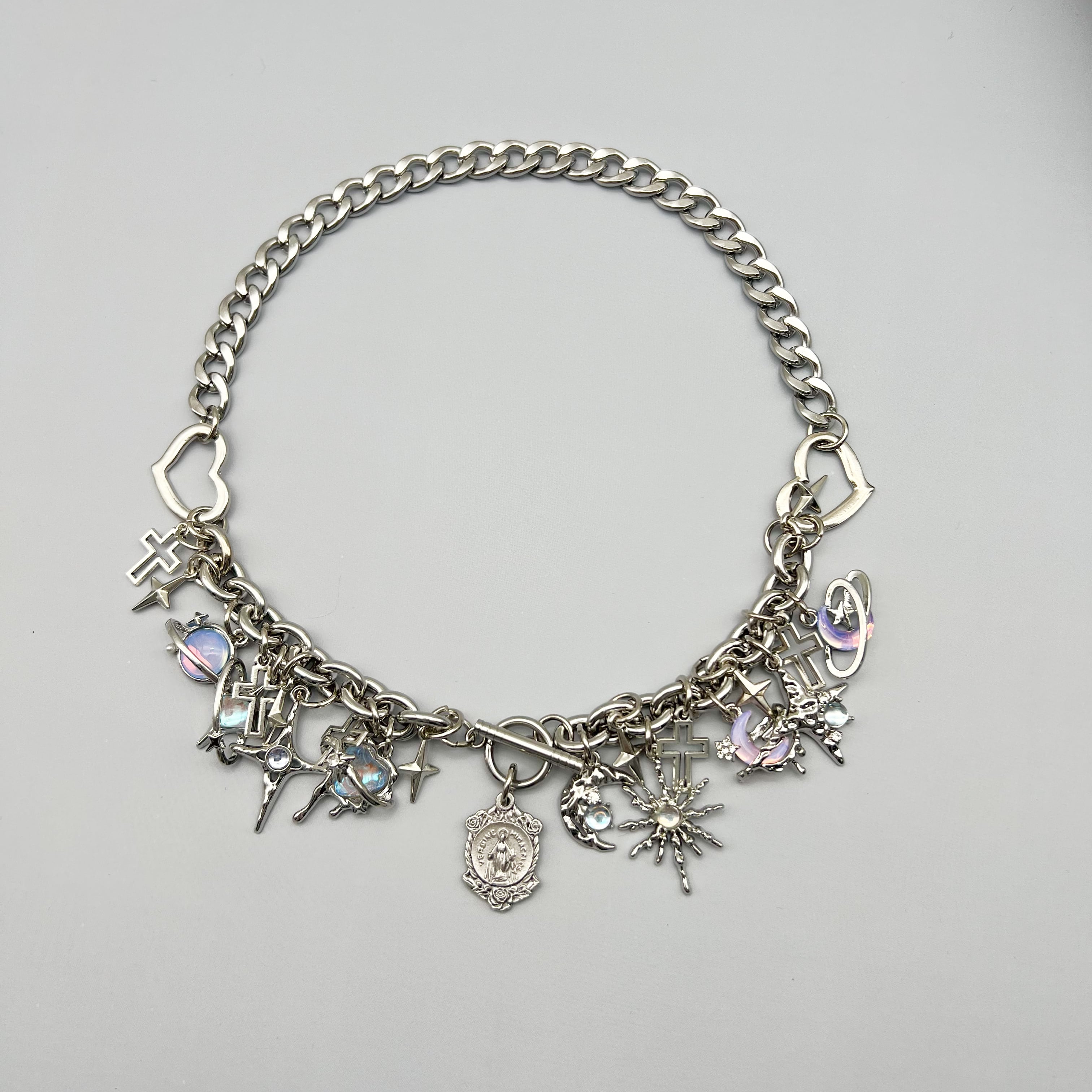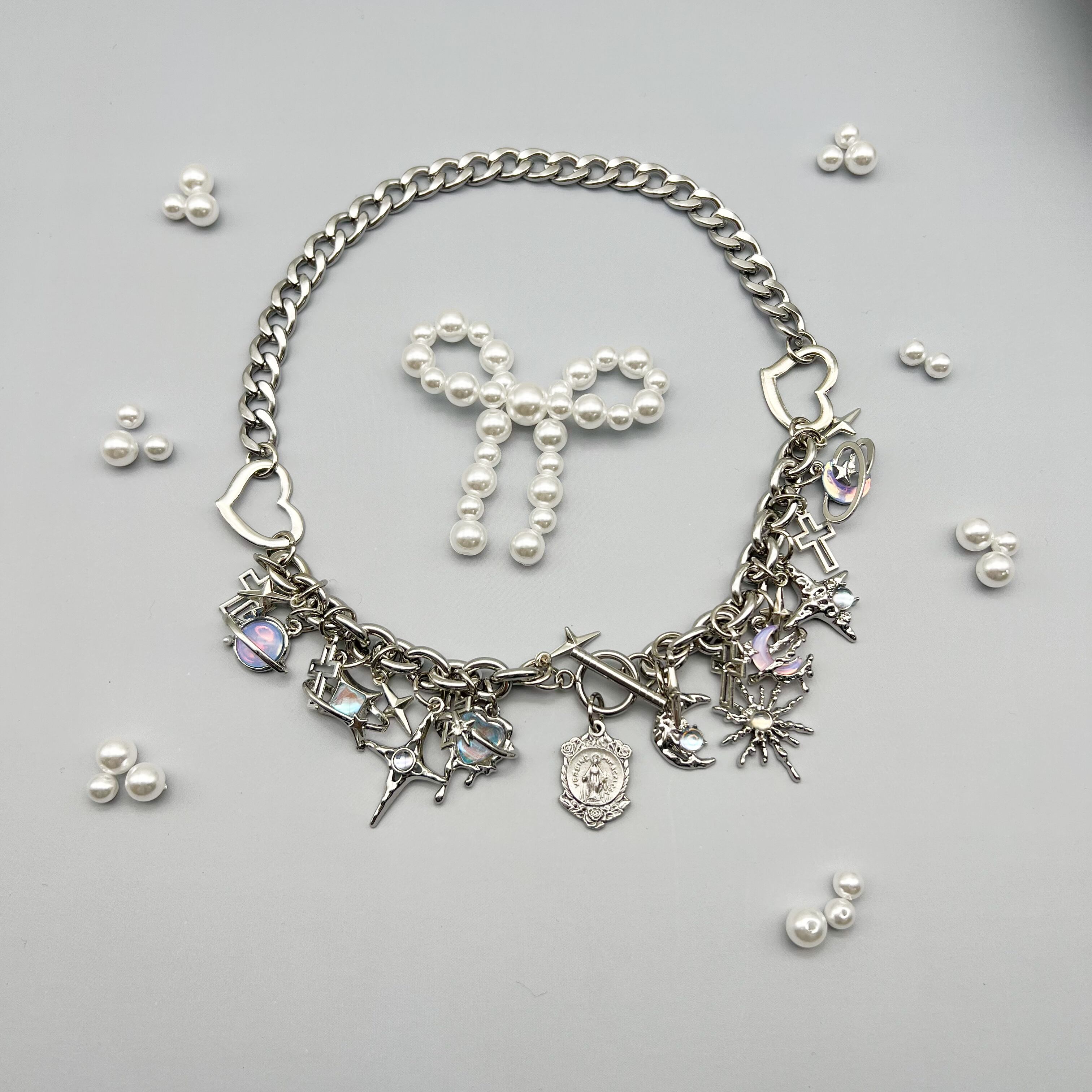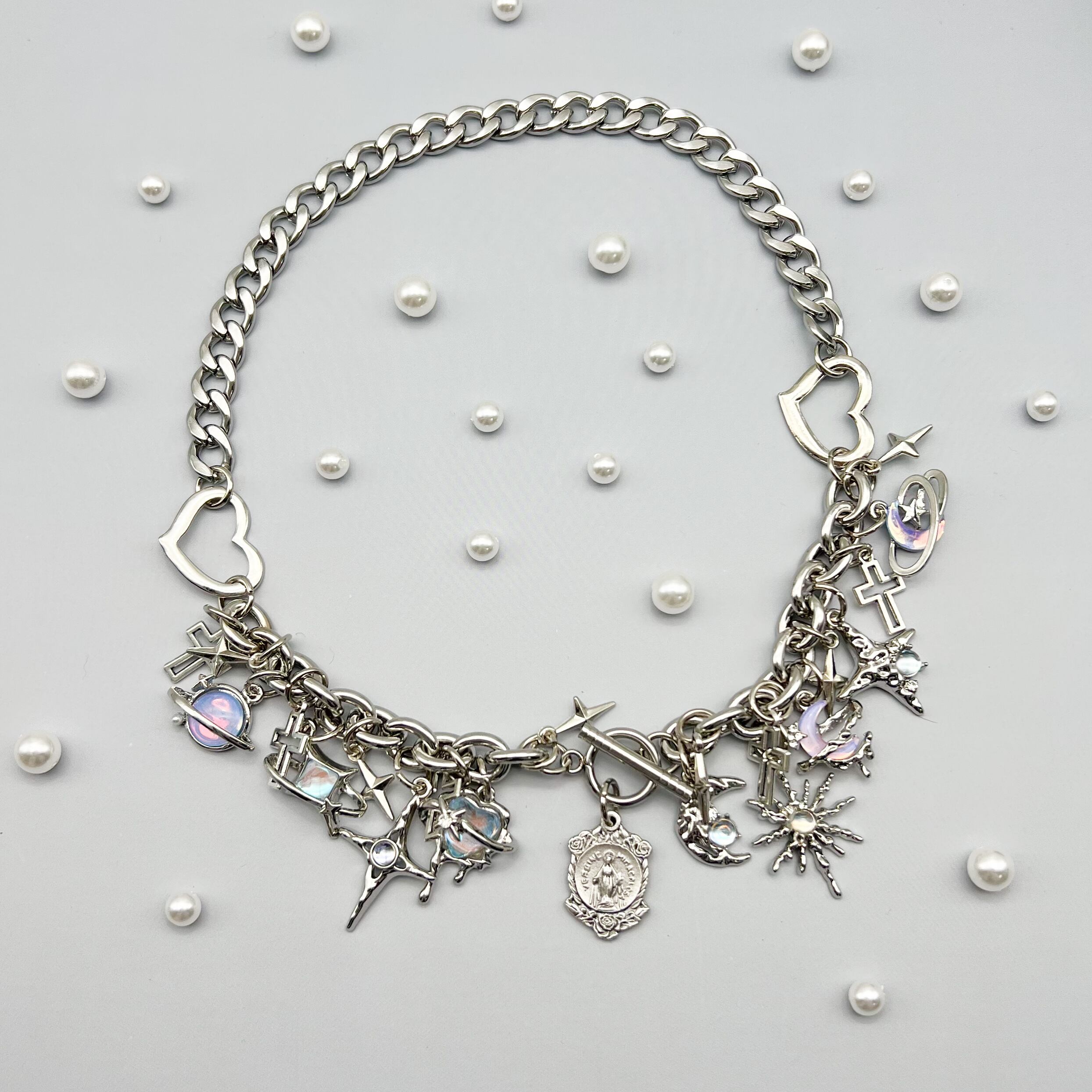 2種類のチェーンをハートチャームで繋ぎ合わせました。